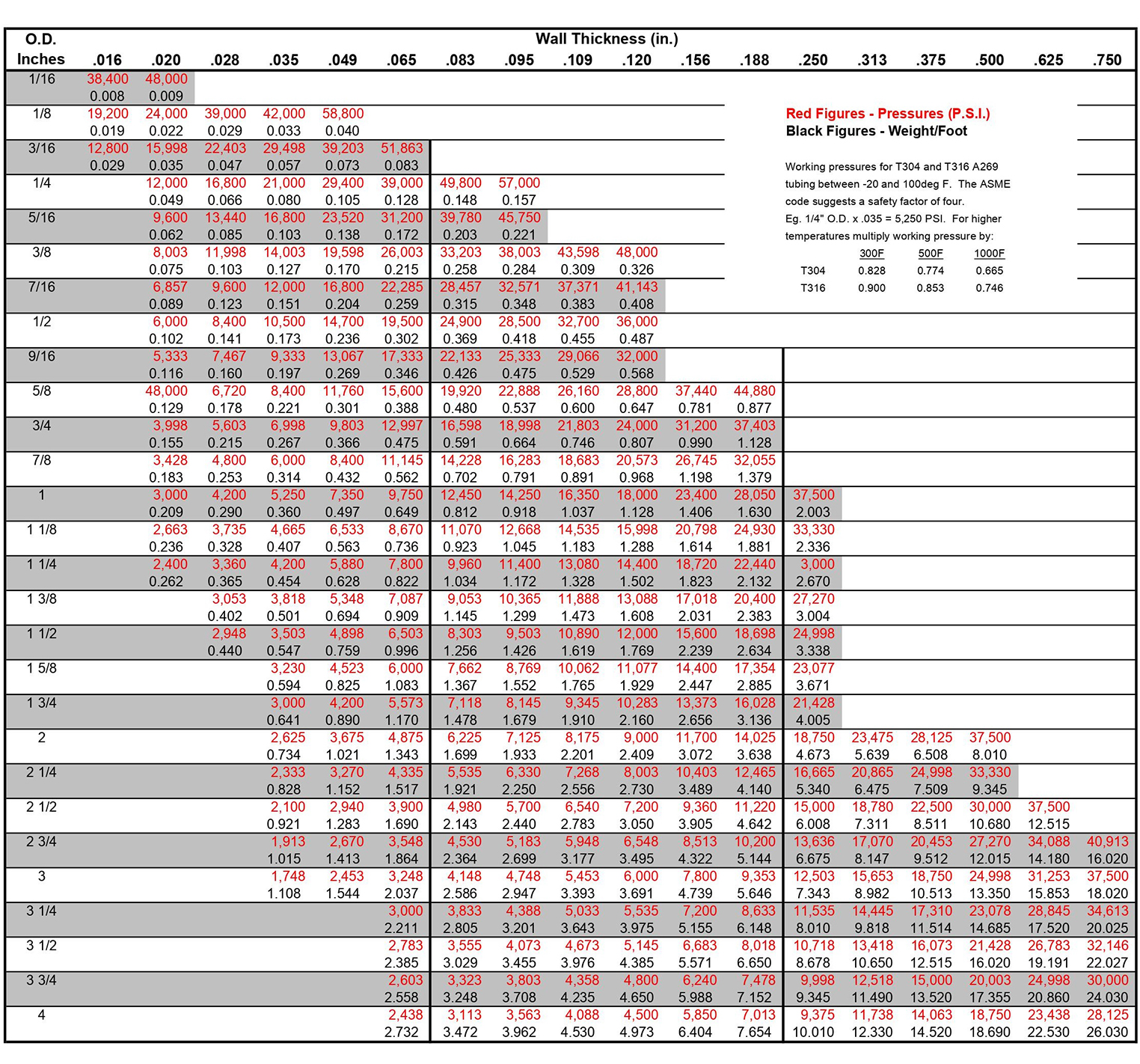 Stainless Tubing Theoretical ruptis pressuris et pondera